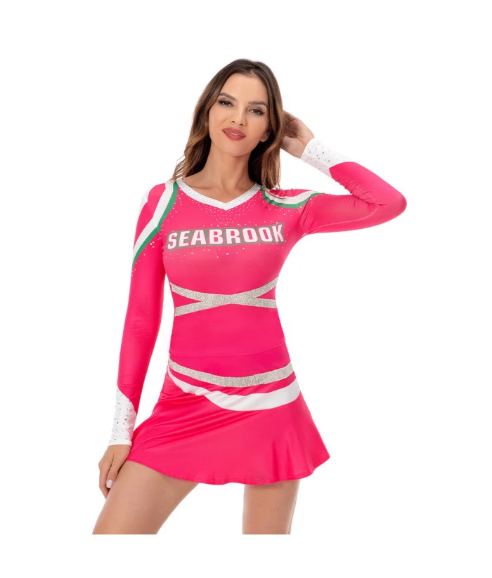 Women Pink Tight Fit Sportwear Cheerleaders Dress Halloween Stage Costume